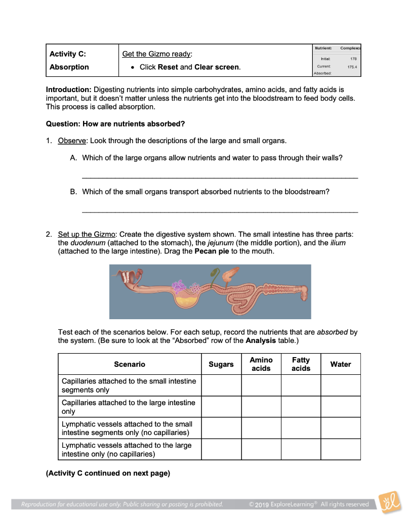 The Digestive System Pdf Free Download from docplayer.net Gizmo answer key gizmos digestive system answers. Small intestine and large intestine 2. Digestive system gizmo quiz answer key + my pdf collection digestive system gizmo quiz answer key. Digestion is a complex process, involving a wide variety of organs and chemicals that work el stem lesson digestive system. Absorption, amino acid, carbohydrate, chemical digestion, chyme, complex carbohydrate, digestion, digestive system, elimination, enzyme, fat, fatty acid, fiber, food calorie, mechanical digestion, monoglyceride, nutrient, peristalsis, protein, starch, sugar, villus prior knowledge questions (do these before using the gizmo.) [note: Find out by designing your own digestive system with the digestive system gizmo. Next, the nutrients move into the bloodstream, a process called absorption. The answers to questions are not programmed;